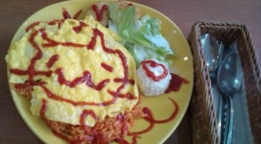 This is Omuraisu at Maid Cafe. It's an omelette withchicken rice and topped with a dollop of red ketchup. |