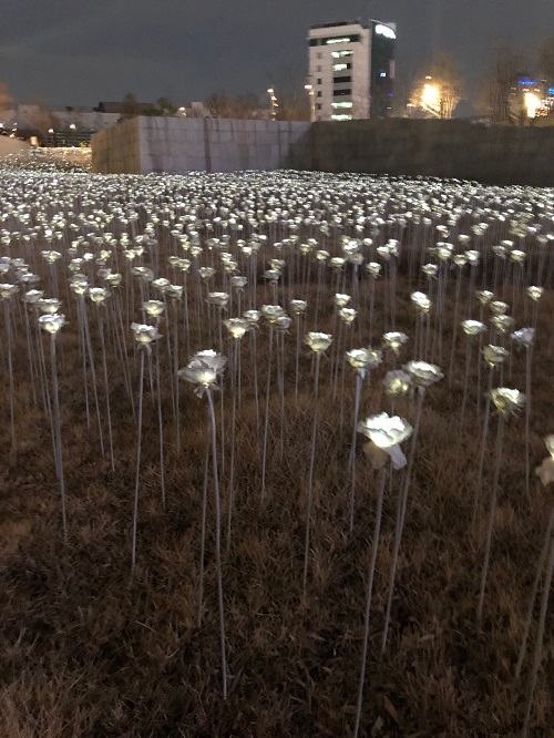 Tongdaemon Design Plaza in Seoul. There was full of white roses. I went there at 9 p.m. but there were many tourists who wanted to see this beautiful white rose garden.