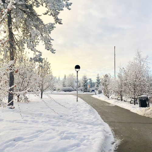 The temperature was -23 degrees. White snow was fallen on the residental street with beautiful tree which was covered with the crystal snow.Whole town was just like a crystal town!