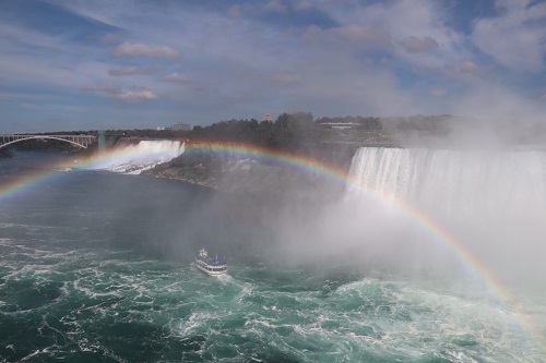 What a beautiful rainbow spanning the Niagara Falls between the United States and Canada. When I saw Niagara Falls from Toronto, some people went down this falls by going on board a cruise.