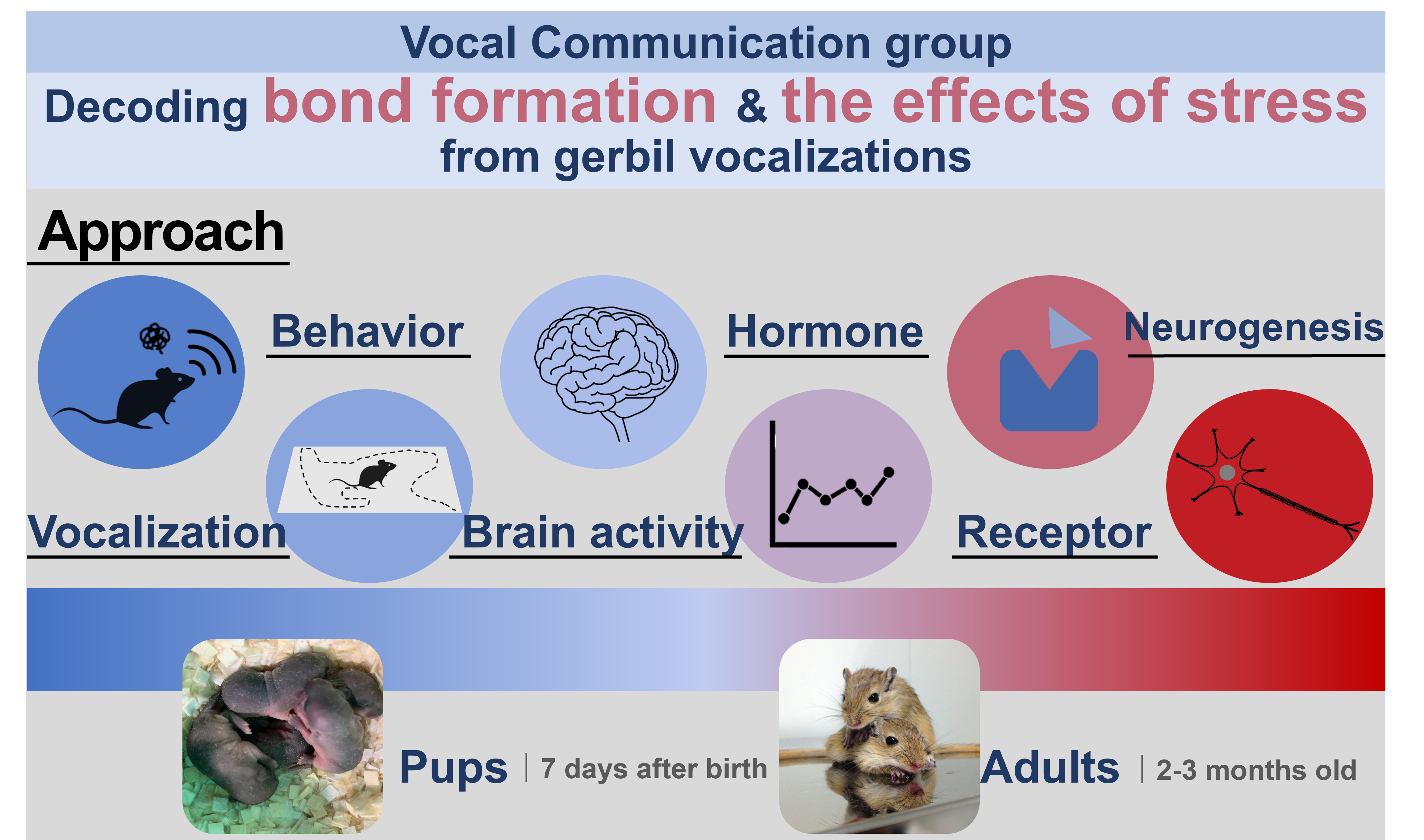 We focus on pups’ care-seeking calls and investigate how MS influences the mother–infant bond. At the adult stage, we examine its impact on the process by which unfamiliar individuals form friendly relationships (approach, huddling, and vocal exchanges).